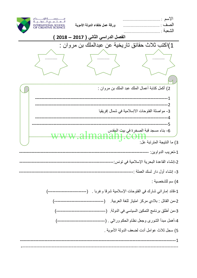 ورقة عمل خلفاء الدولة الاموية الصف الثامن اجتماعيات الفصل الثاني المناهج الإماراتية